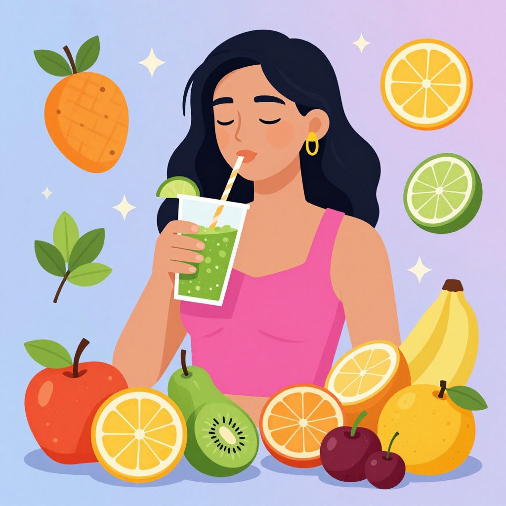 Digital illustration of a woman with dark hair, wearing a pink tank top, drinking a green smoothie surrounded by vibrant fruits and citrus slices.