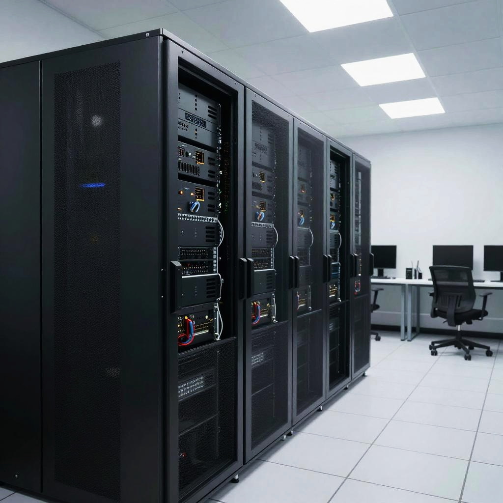 Photograph of a modern, well-lit office with black server racks filled with network equipment, white-tiled floor, and a white desk with monitors