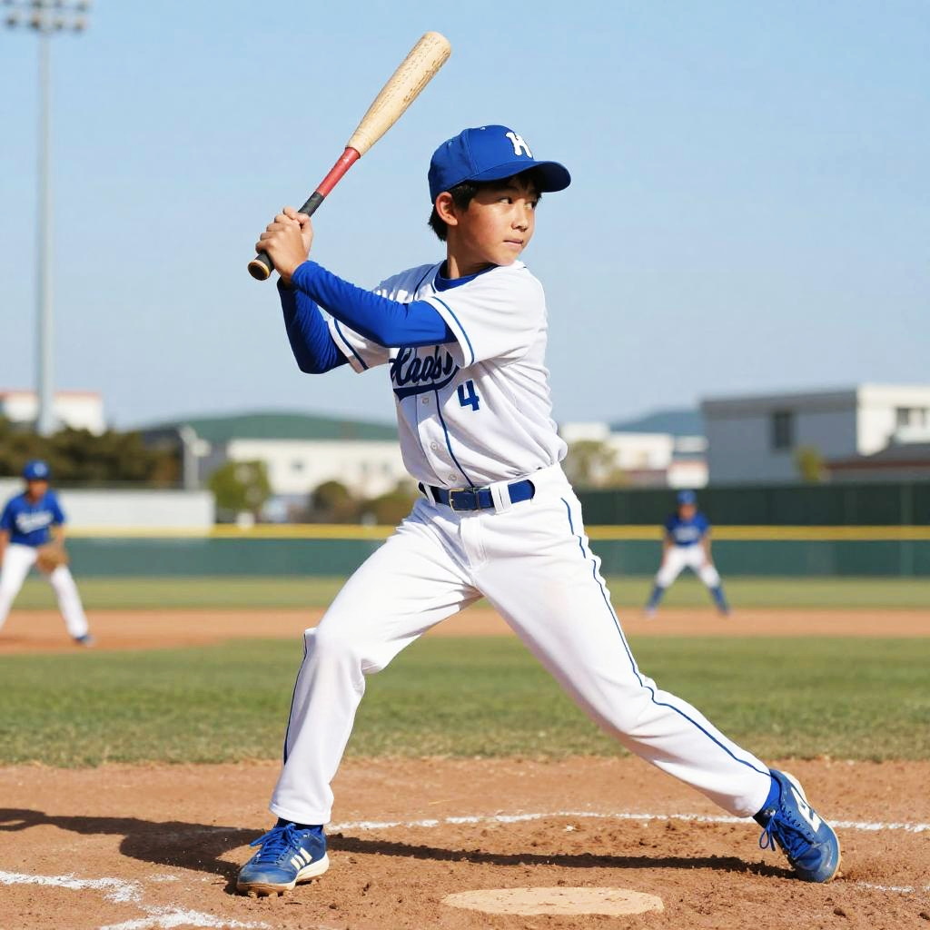 Japanese 14 year old boy playing baseball in school uniform on a sunny afternoon, green field and blue sky, action shot capturing motion and youthful energy