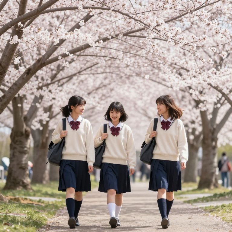 Colegialas in traditional school uniforms walking through a sunny park filled with cherry blossom trees, detailed fabric textures, soft natural lighting, vibrant pastel colors, cinematic composition, serene and nostalgic atmosphere