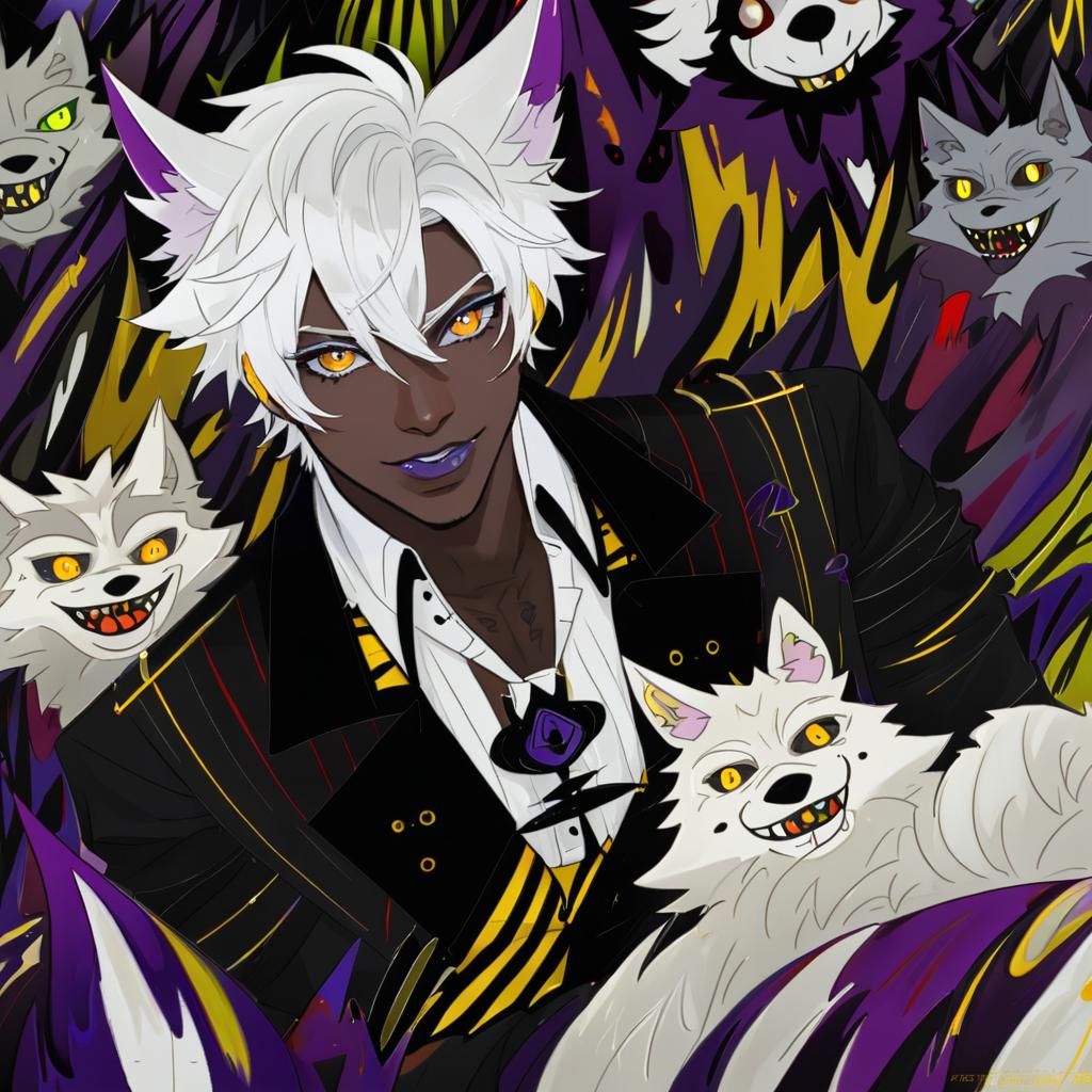 Jack howl, twisted wonderland, 1boy, wolf boy, dark-skinned male, wolf ears, wolf tail, animal ear fluff, yellow eyes, short hair, white hair, by artist mossacannibalis, anime
