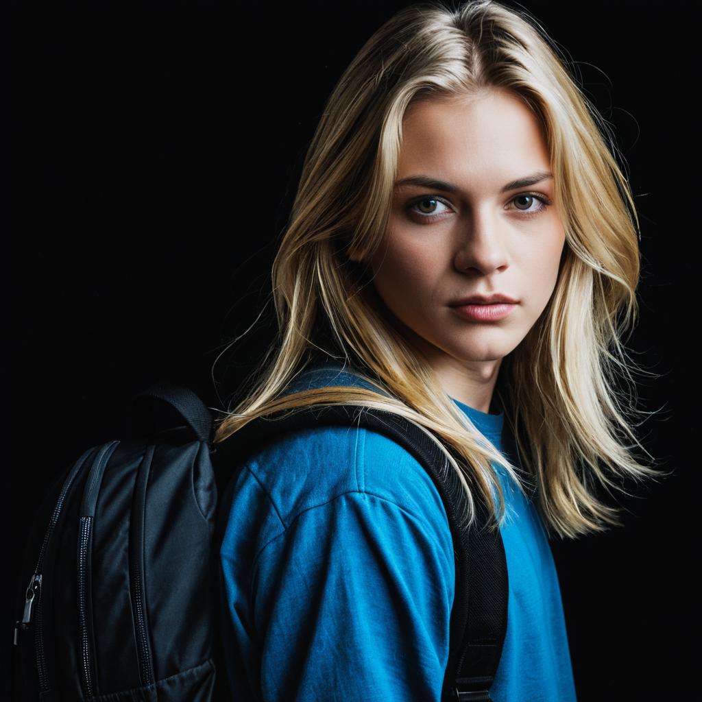 Photorealistic close-up of a young blonde woman with medium-length hair and blue eyes, wearing a blue long-sleeve shirt and carrying a black backpack against a solid black background. The subject looks directly at the viewer with a neutral expression.