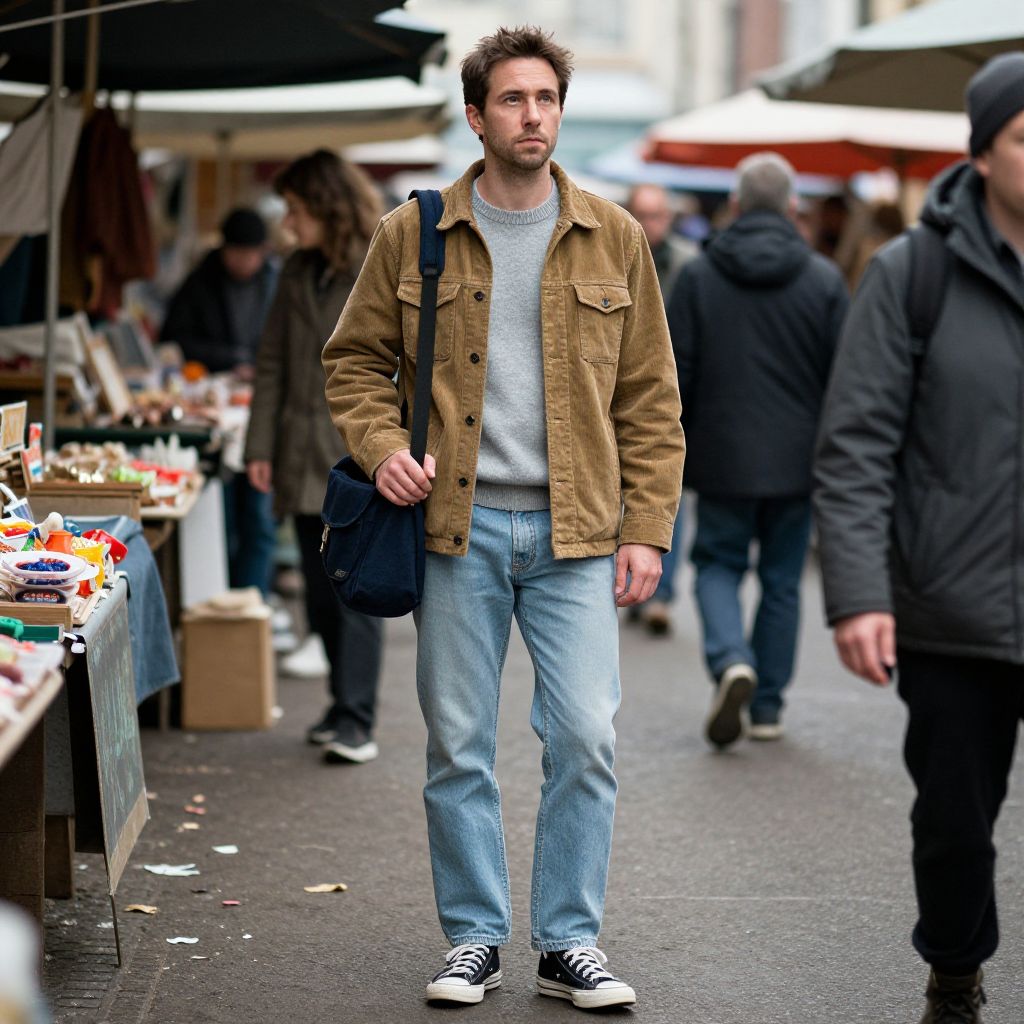 A man, casual corduroy jacket, grey crew neck sweater, light wash straight-leg jeans, black high-top sneakers, navy canvas messenger bag, bustling market stalls, chromogenic film style, thoughtful expression Man has masculine face and piercing eyes