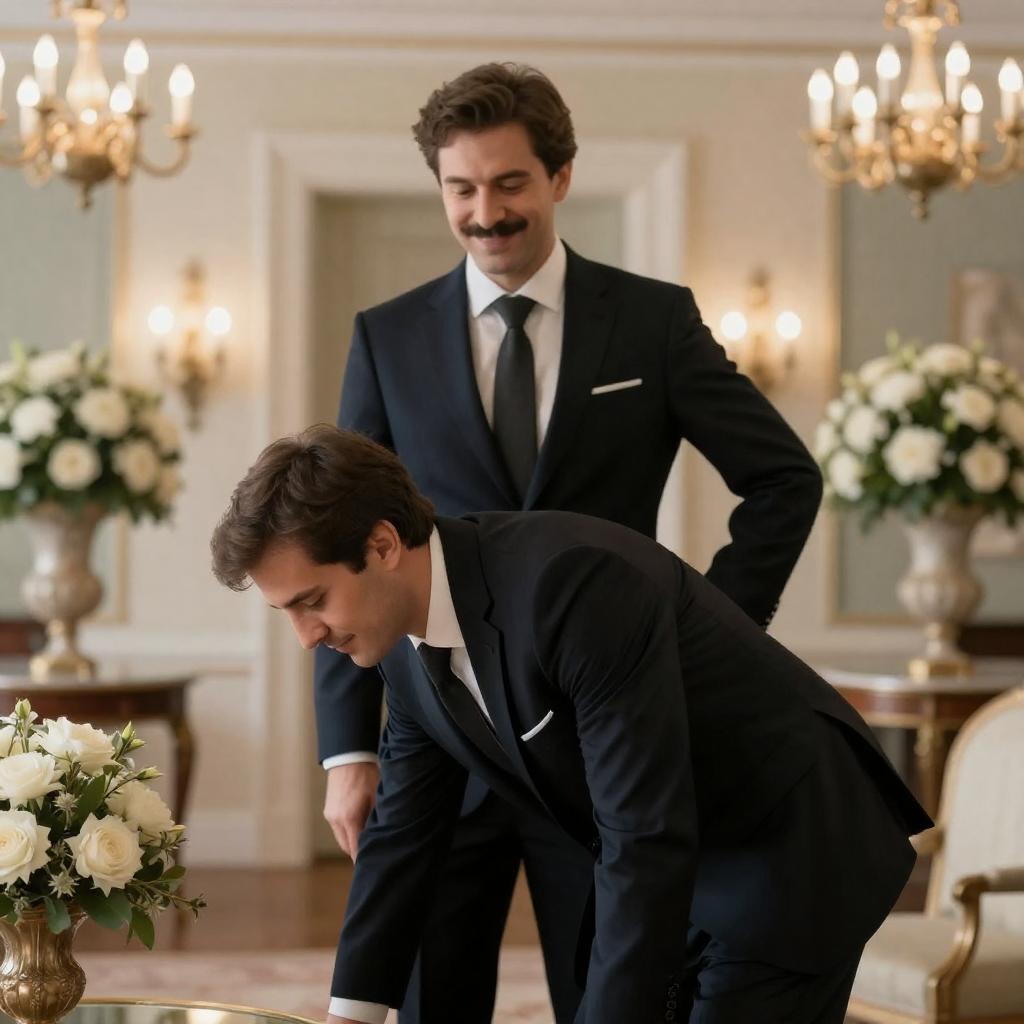 Photograph of two men in a formal room. Man standing behind, dark suit, brown hair, mustache, hand on hip, smiling. Man leaning forward, dark suit, brown hair, looking down. Floral arrangements and chandeliers in the background.