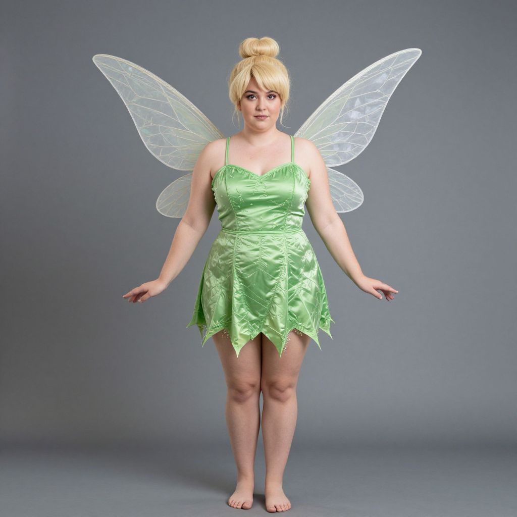 Plus size plus tinkerbell, solo, wings, dress, green dress, parody, blonde hair, 1girl, fat, fairy wings, hair bun, crossdressing, realistic