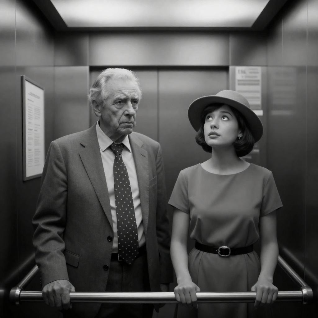 Black-and-white photograph of an older man and a young woman in a metal elevator. Man has gray hair, wearing suit and polka dot tie, looking concerned. Woman with short hair, hat, and dress, looking upward. Elevator interior visible.