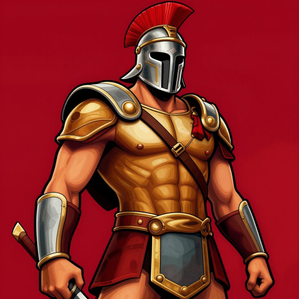 Digital illustration of a muscular, helmeted Spartan warrior with red plume, gold armor, leather skirt, and sword, against a vibrant red background.