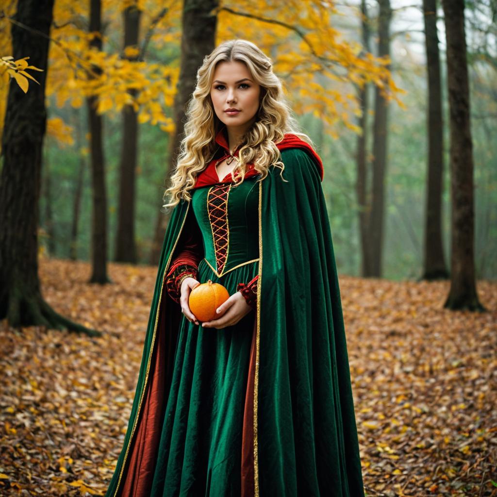 Photo of a young blonde woman wearing a medieval-style green and red dress with detailed fabric and a matching cape with gold trim. She stands in a misty forest in autumn with yellow-orange leaves covering the ground and trees. The woman holds a small orange pumpkin with a serious expression, creating a fantasy and cinematic atmosphere.