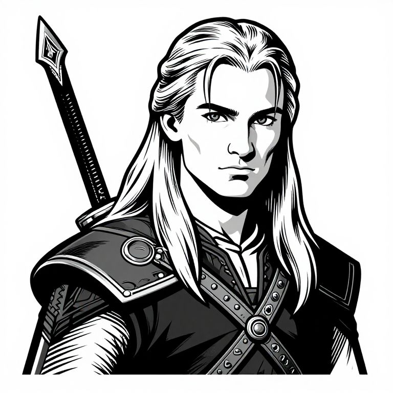 Black-and-white digital drawing of a stern, long-haired male warrior with a sword on his back, wearing ornate armor. Bold, high-contrast