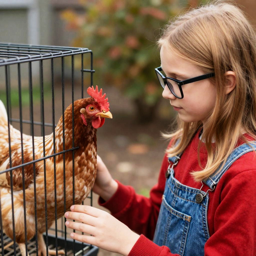 Photograph of a blonde child in an orange shirt and striped socks, sitting on a wooden stump, holding a zebra-striped chicken. A brown dog with a gold-studded collar, tongue out, stands beside them on grass. Background includes trees and a wooden fence. Child smiles. Dog has intense expression. Two people.