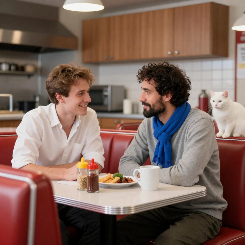 Photograph of two men in a diner, seated in a red booth with a white cat on the right. The man on the left has short brown hair, wears a white shirt, and smiles at the bearded man on the right, who has curly hair, a gray sweater, and a blue scarf. They share a table with condiments, a white mug, and a plate of food. The background features a kitchen with wooden cabinets and stainless steel appliances.