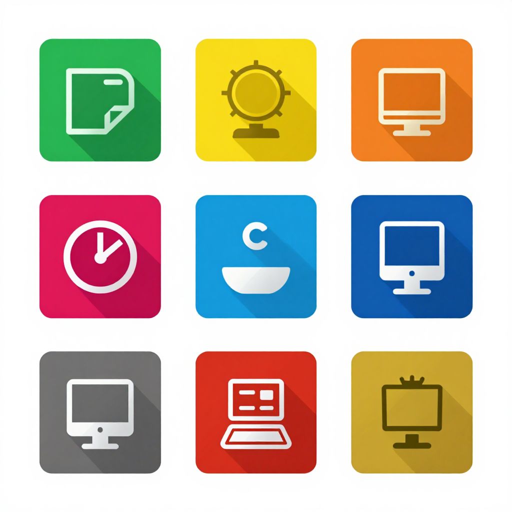 Grid of nine colorful square icons with white symbols: document, globe, monitor, clock, cup, computer, laptop, tablet, and TV, each