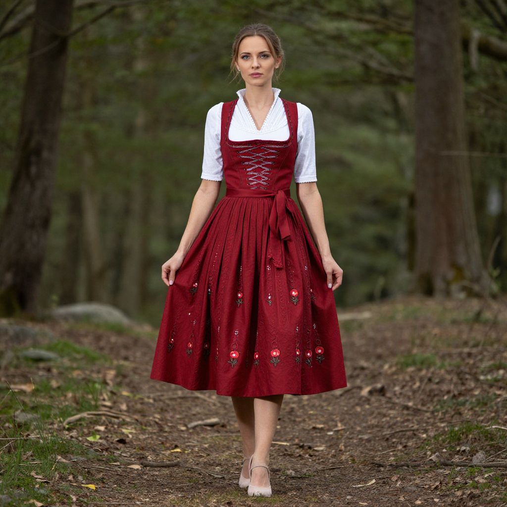 Woman in Vibrant Midi Dirndl in Forest