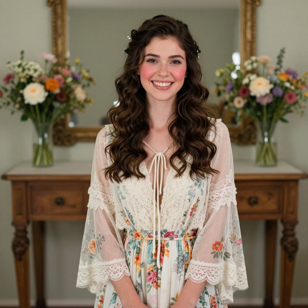 Photograph of a young woman with fair skin and long, wavy dark brown hair, smiling brightly at the camera. She wears a sheer, white lace dress with floral patterns and delicate embroidery on the sleeves and neckline, tied with a small bow at the front. Behind her, a wooden console table holds two large, colorful flower arrangements in glass vases, set against a pale green wall with a gold-framed mirror. The soft lighting highlights her rosy cheeks and the intricate details of her dress.