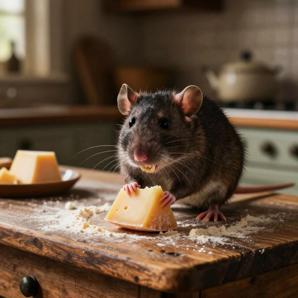 Rat with big teeth gnawing on a piece of cheese in an old rustic kitchen, warm lighting, high detail on whiskers and teeth, wooden surfaces covered in flour dust, cozy but slightly eerie atmosphere