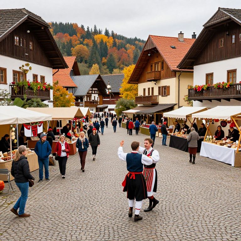 Gallen, a quaint European village square during a lively festival, cobblestone streets filled with colorful market stalls and joyful townsfolk, the character Gallen in traditional attire performing a folk dance, warm autumn colors, detailed cultural scene.