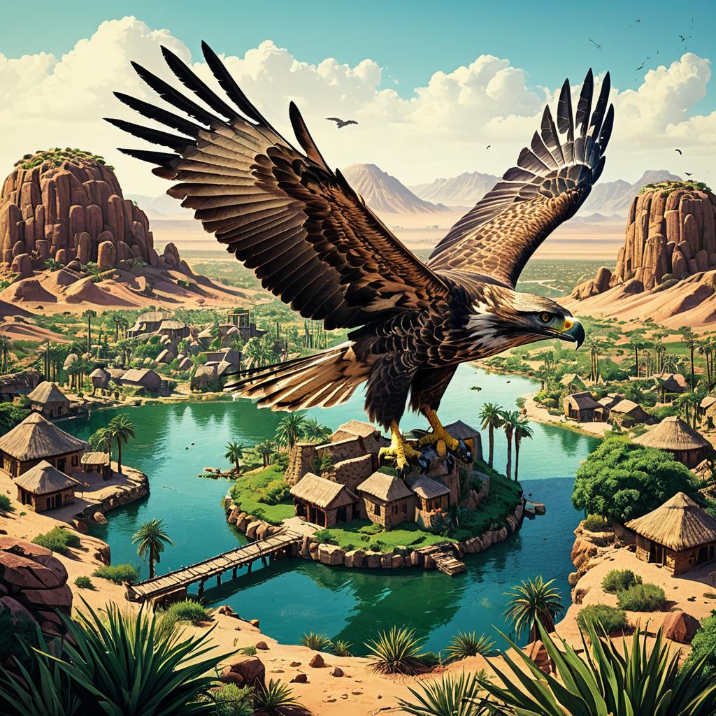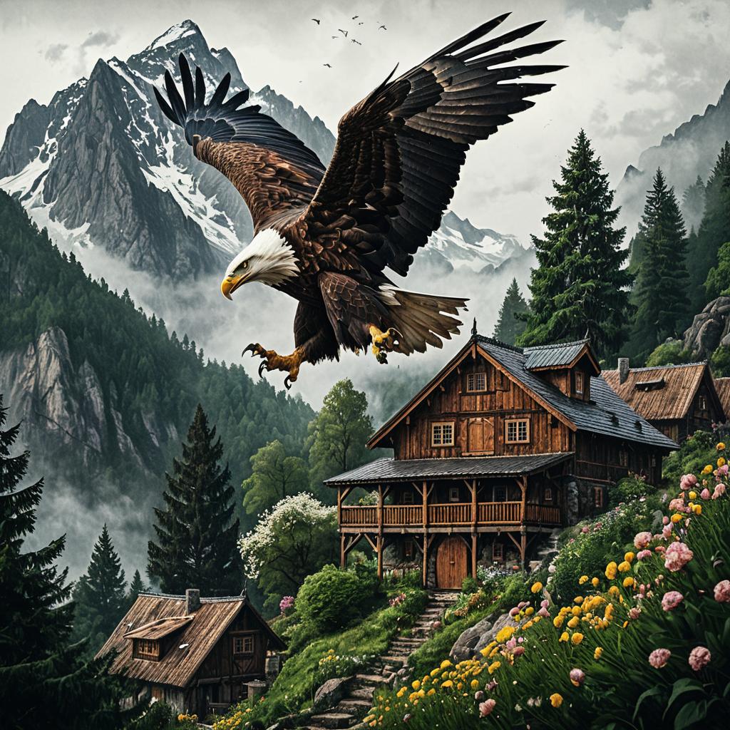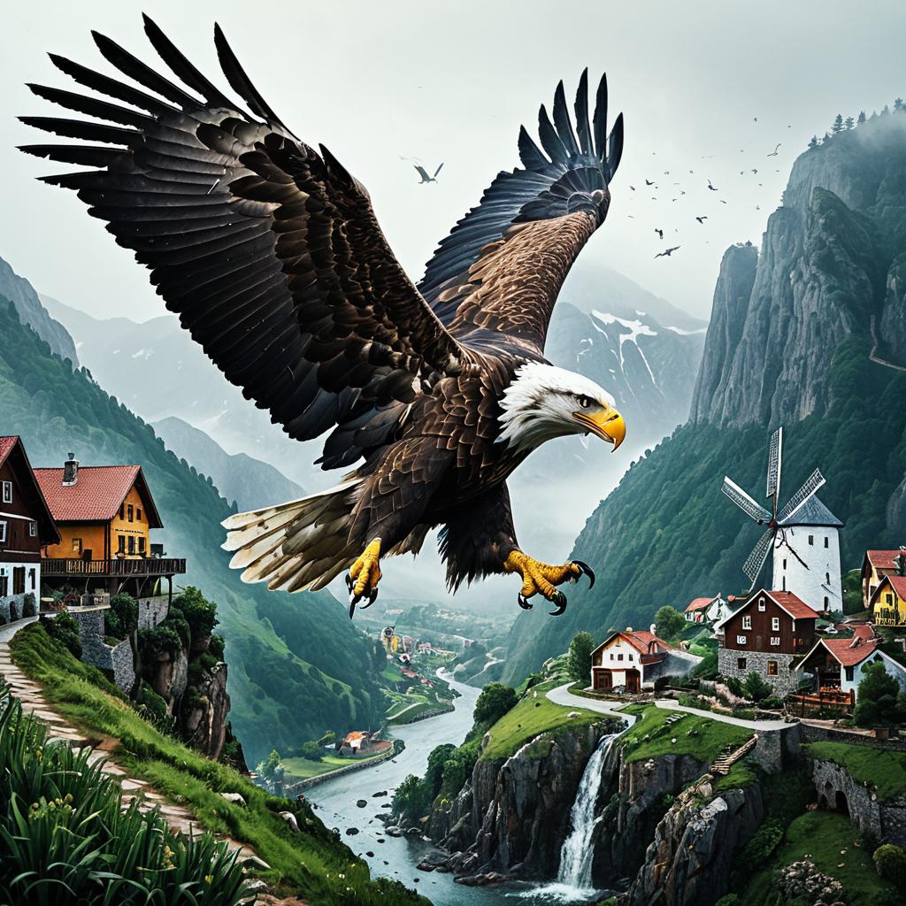 Illustrated concept art of a gigantic spider carrying a forested plateau on its back, lush greenery, small village with wooden cottages, misty mountains, fantasy landscape, vibrant colors, hanging bridges.