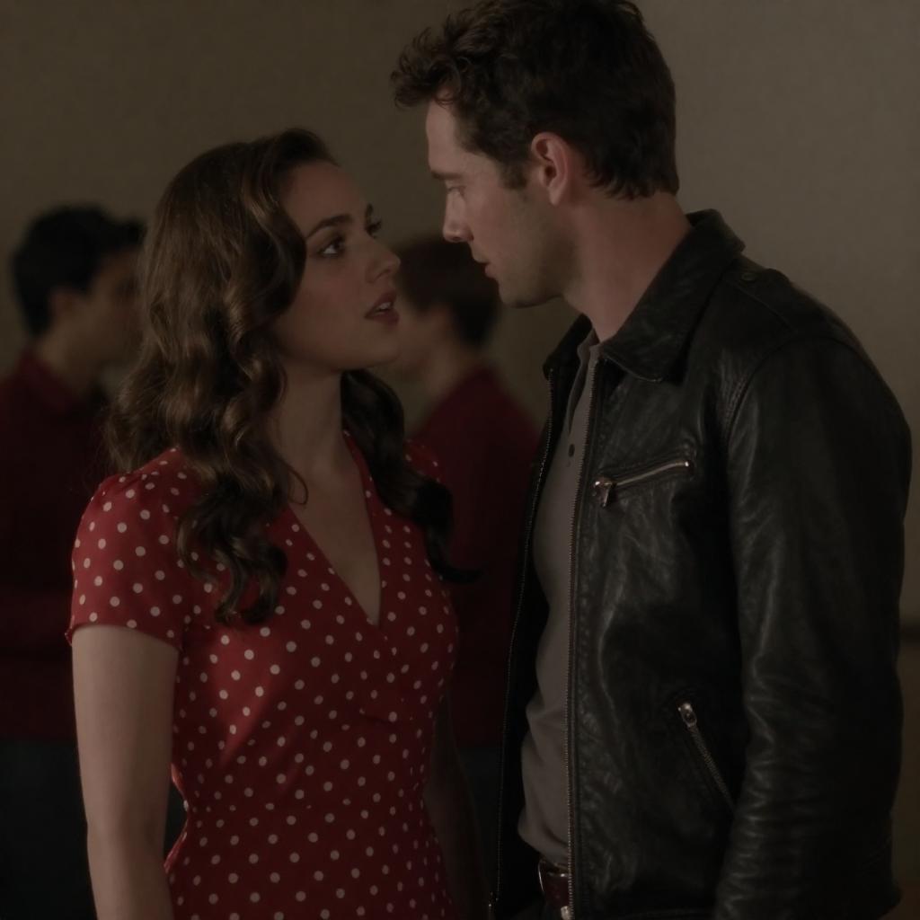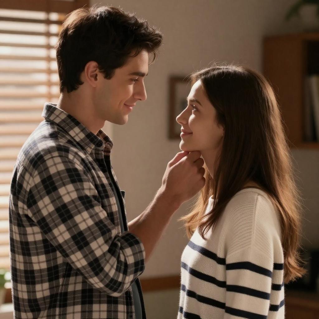 Photograph of a man and woman in a dimly lit, crowded setting. The man, with short dark hair and wearing a black shirt, leans close to the woman, who has straight brown hair and red lipstick, wearing a dark top. They gaze into each other's eyes with soft smiles. The background is blurred with indistinct figures and pinkish lighting.