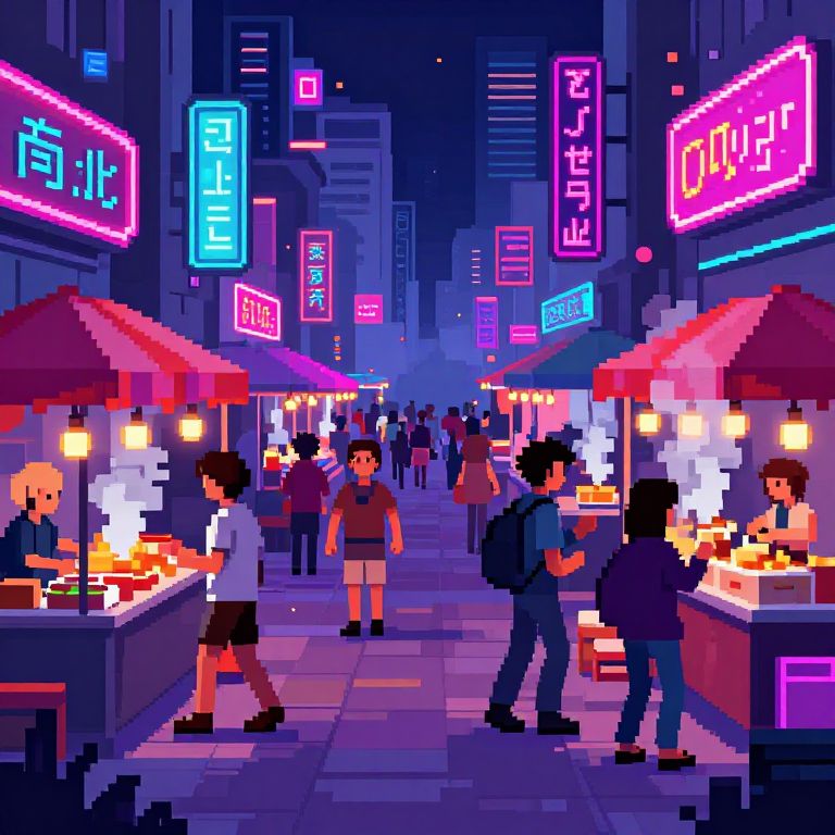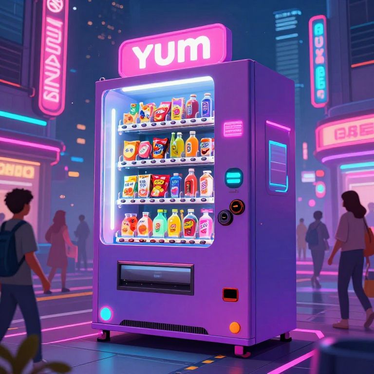 Yum illustration showing a futuristic vending machine dispensing exotic snacks and beverages inside a neon-lit cyberpunk city street, dynamic composition with glowing signs, diverse urban crowd, and intricate mechanical elements, vibrant and detailed digital art