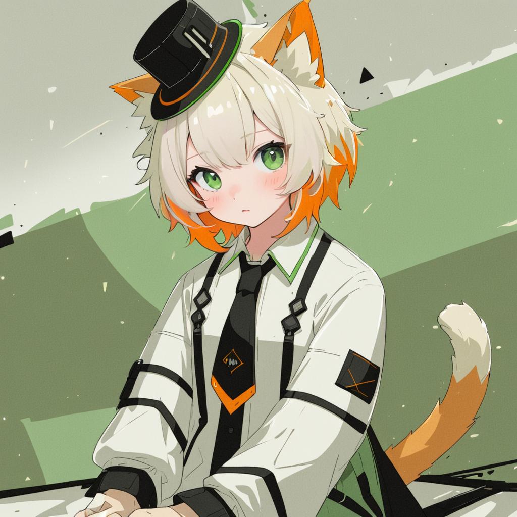 Mousse (arknights), arknights, 1girl, cat girl, cat ears, cat tail, animal ear fluff, two tails, green eyes, white hair, short hair, blonde hair, orange hair, two-tone hair, brown hair, multicolored hair, white shirt, black headwear, mini hat, collared shirt, long sleeves, black necktie, by artist poaro, illustrious