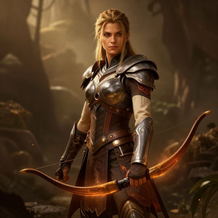 A digital CGI image of a blonde, fierce-looking woman standing in a dimly lit, misty forest. She wears detailed, dark metallic armor with intricate designs, including shoulder plates and gauntlets. Her long hair is tied back, and her intense gaze is directed forward. She holds a glowing, curved wooden bow in her right hand. The background features blurred trees and rocks, adding a mystical atmosphere. The lighting highlights her armor and bow, casting a warm, amber glow. The overall style is fantasy, with realistic textures and a dramatic, epic tone.