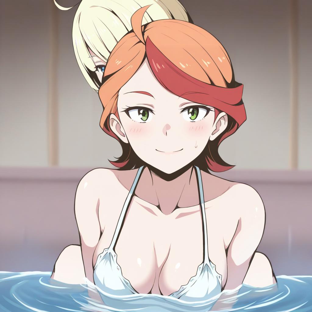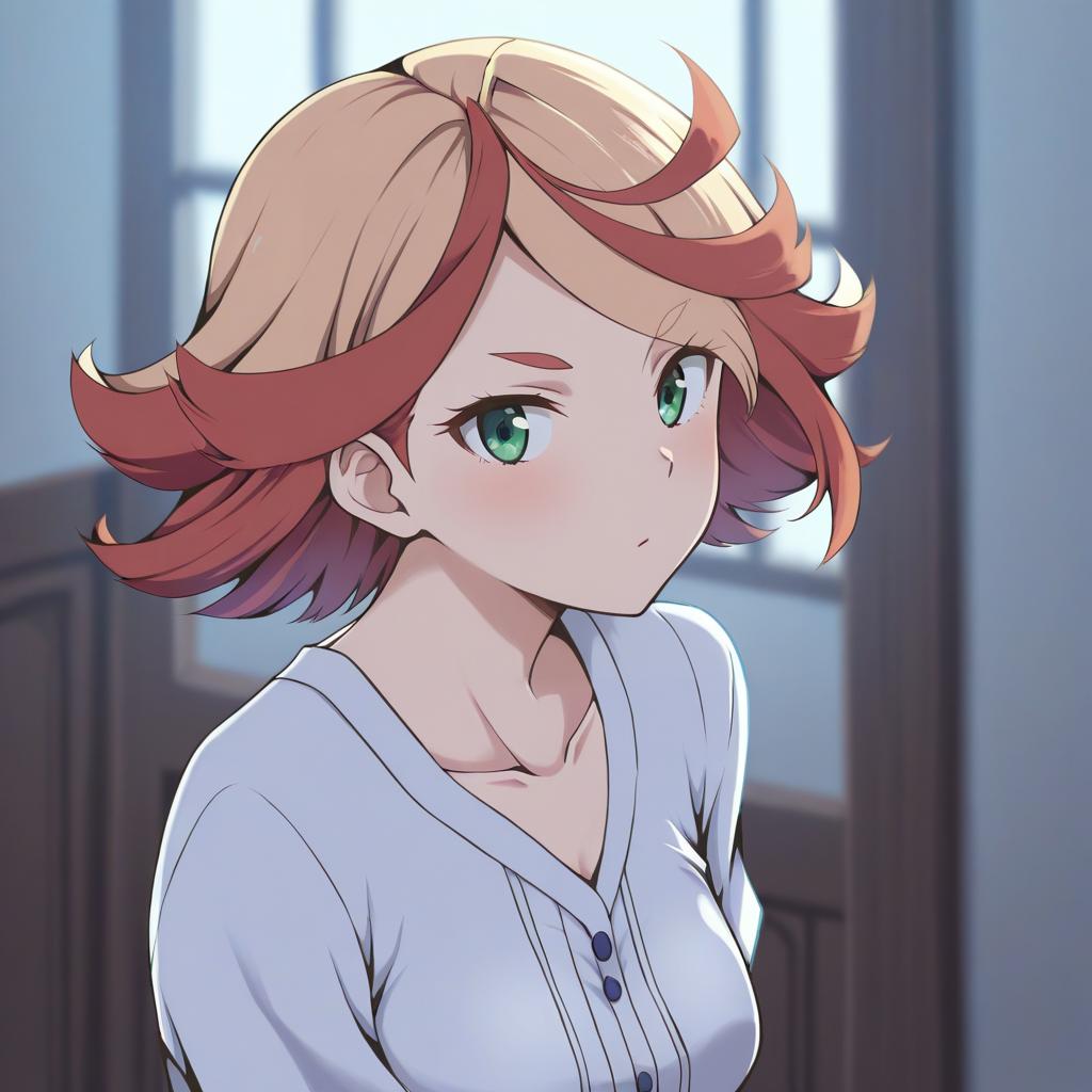 Amanda o'neill, little witch academia, 1girl, green eyes, short hair, orange hair, two-tone hair, red hair, ahoge, medium breasts, by artist taira yuuki, illustrious