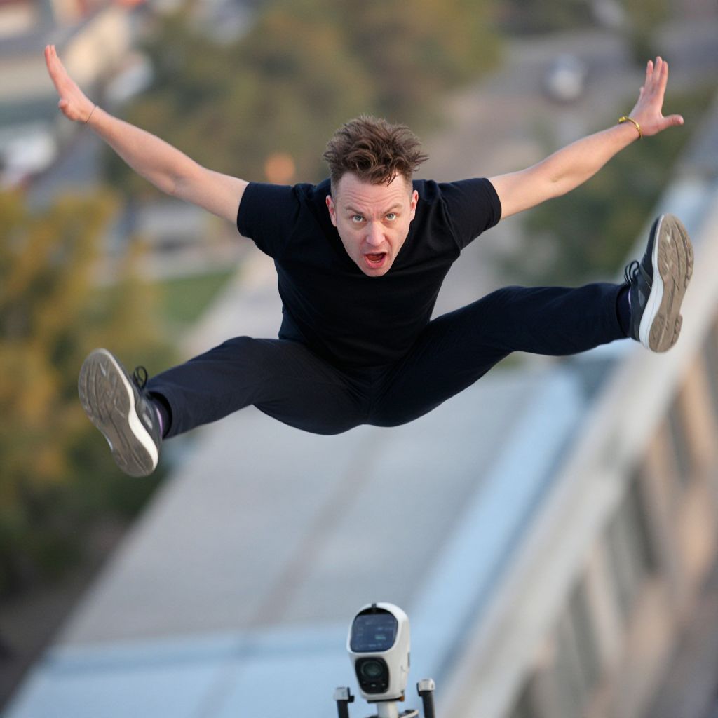 Photograph of a young man with spiky brown hair, wearing a black t-shirt and pants, mid-air in a wide split jump over a drone
