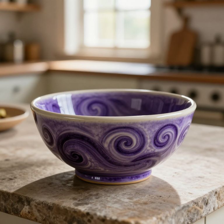 Photograph of a purple ceramic bowl with swirling white patterns, placed on a rustic, textured wooden countertop in a sunlit kitchen. The bowl is centered in the image, with soft light highlighting its glossy surface. The background is slightly blurred, featuring a white cabinet, wooden cutting boards, and a window letting in natural light. The overall color palette includes earthy tones, with the purple bowl providing a striking contrast. The style is realistic with a focus on natural light and texture.