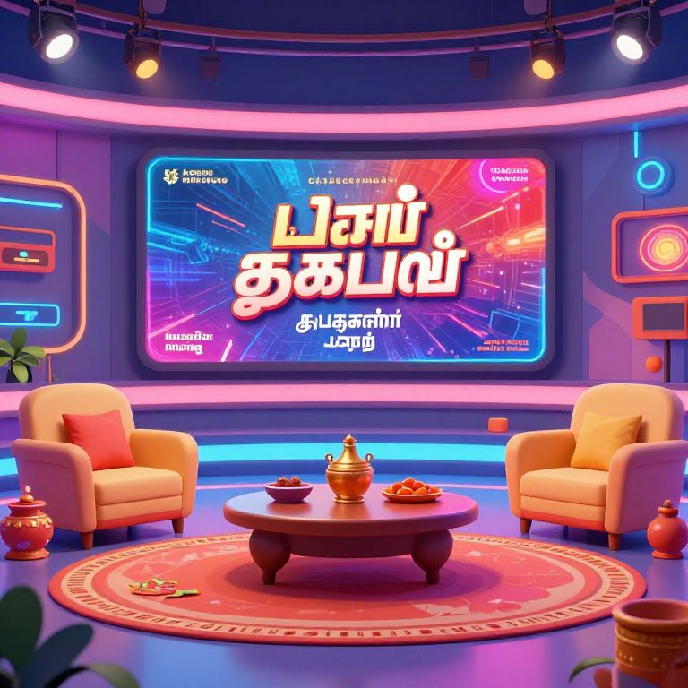Prompt Tamil latest: A vibrant, modern digital illustration showing the latest Tamil film promotions in a futuristic film studio, with glowing screens, multilingual subtitles, and vibrant South Indian cultural elements like traditional silks and handcrafted props.