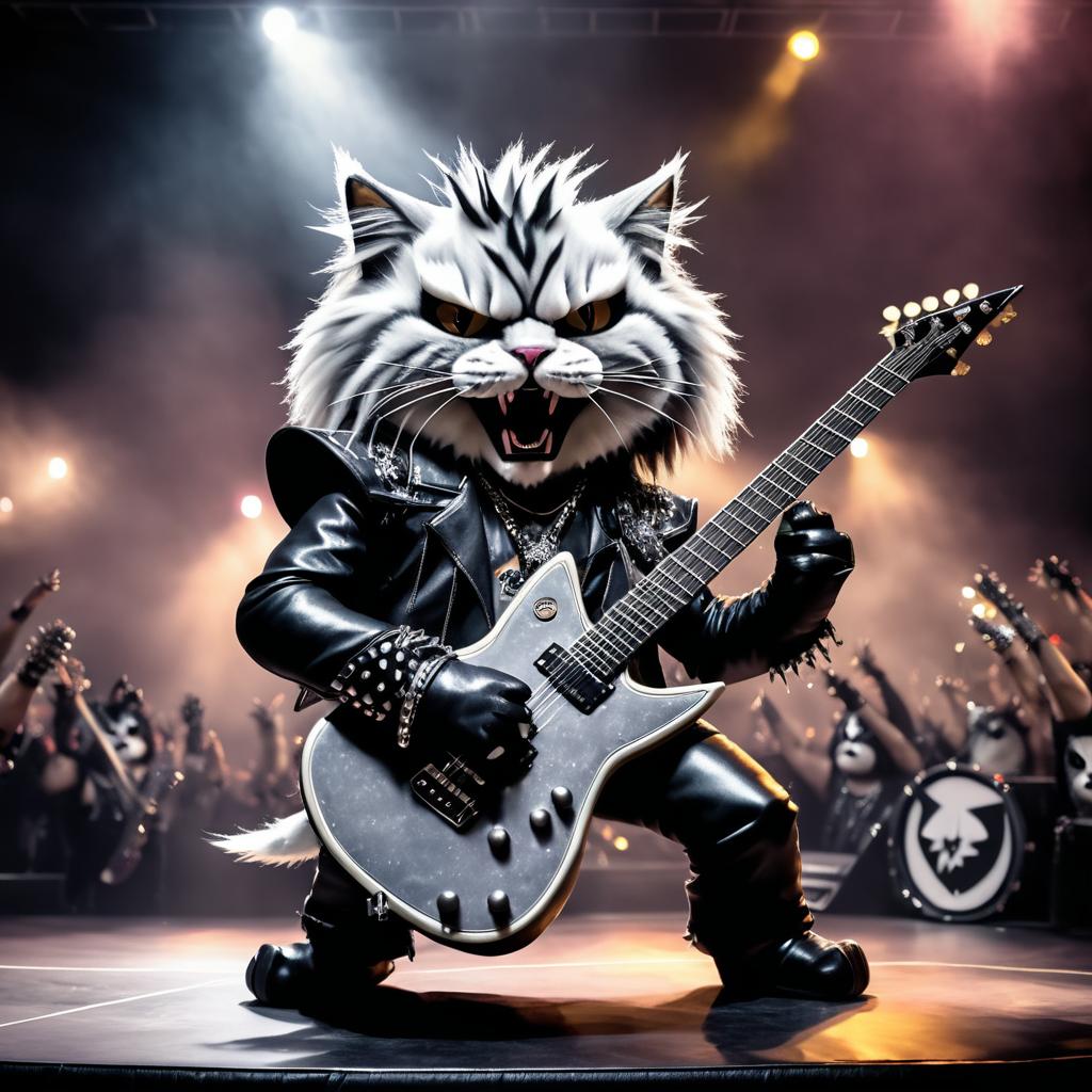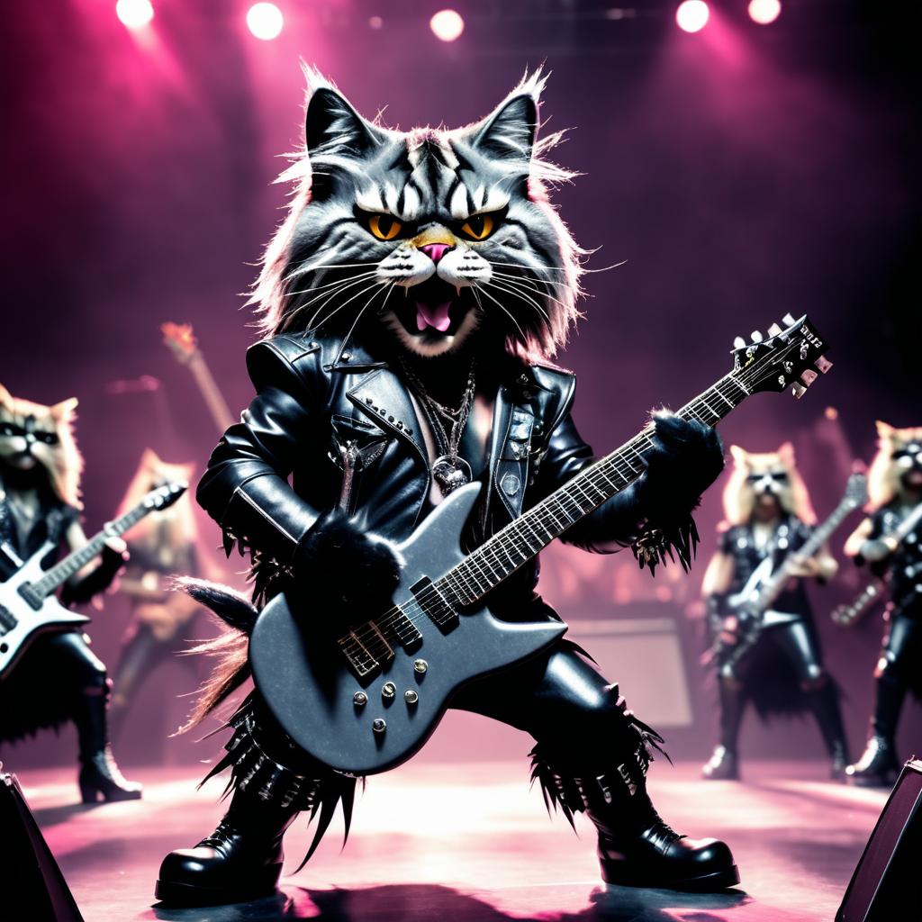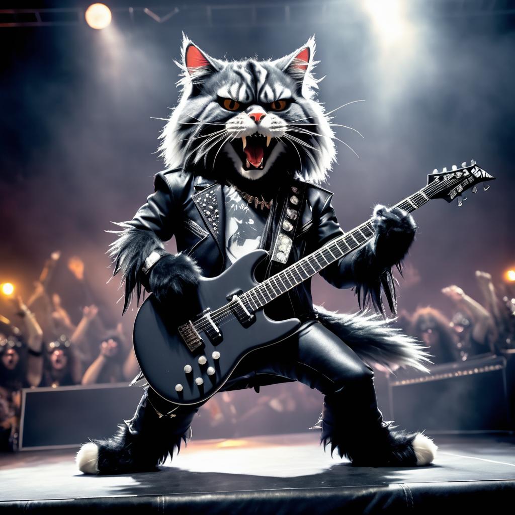Anthropomorphic cat dressed as a heavy metal rock star, playing guitar on stage before a headbanging crowd, dark and photorealistic.
