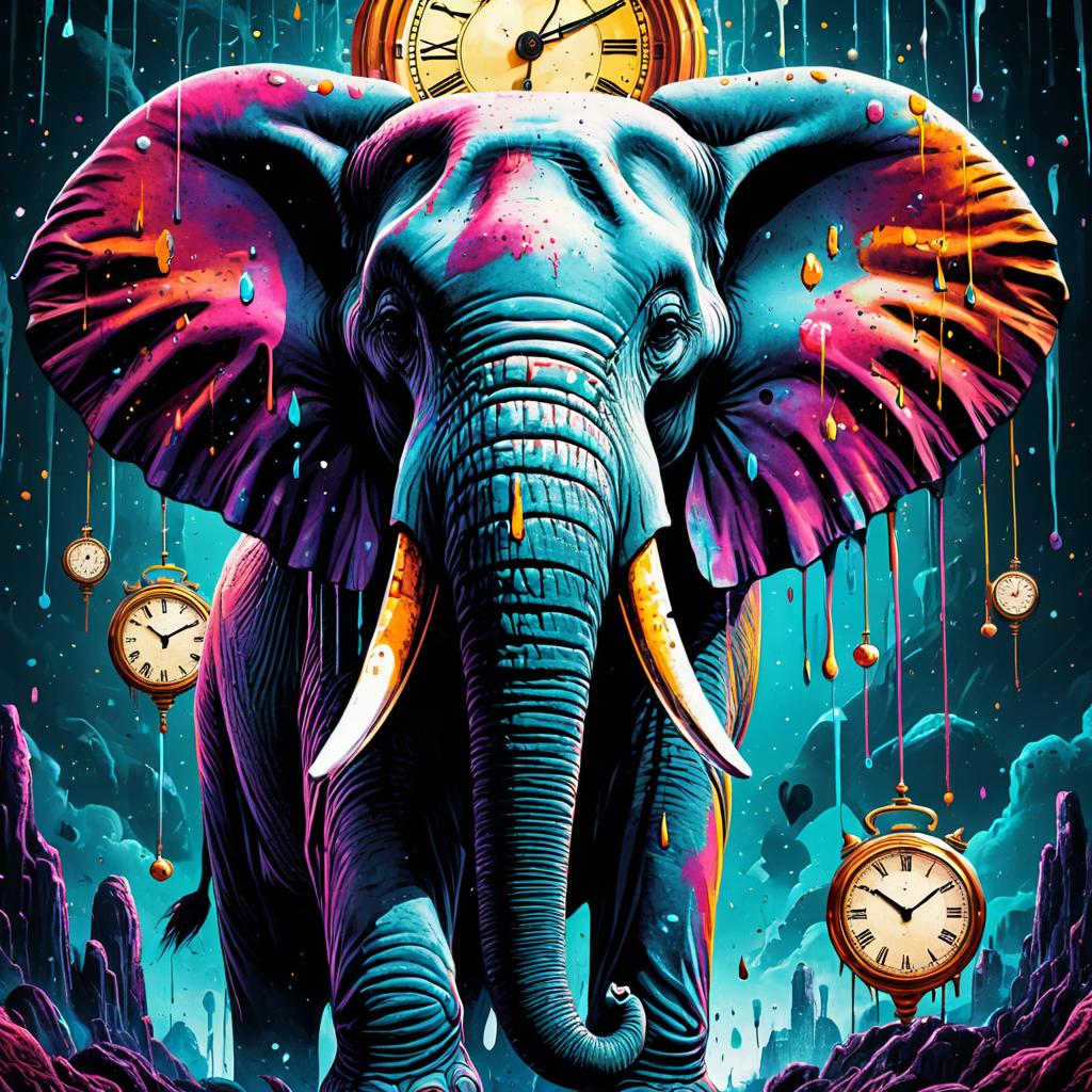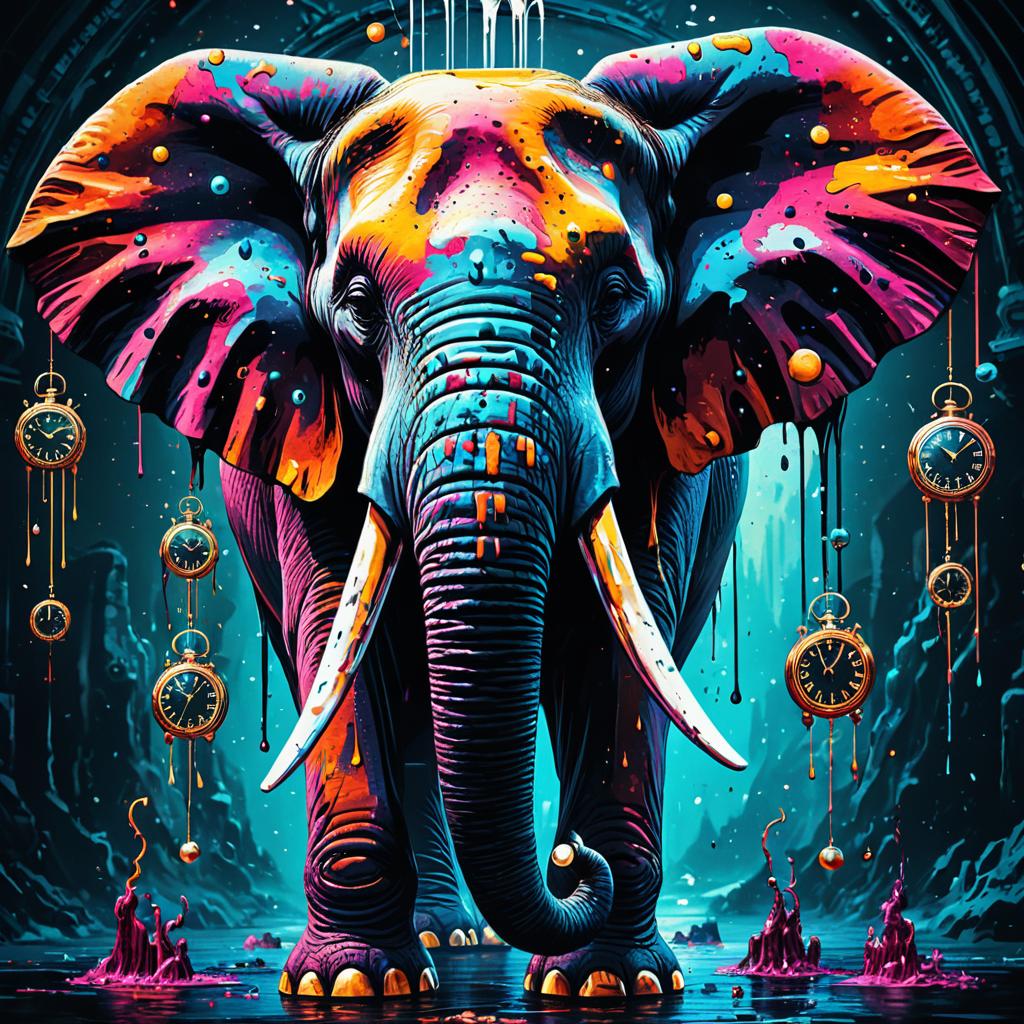 Surreal 8K digital illustration of a towering elephant featuring melting clocks integrated into its ears and face. The image uses vibrant, intense colors with dripping textures and warped shapes, creating a dreamlike and surreal atmosphere with ultra-detailed lighting effects.