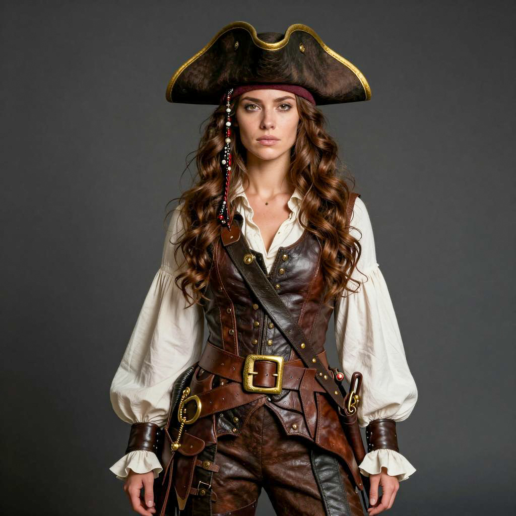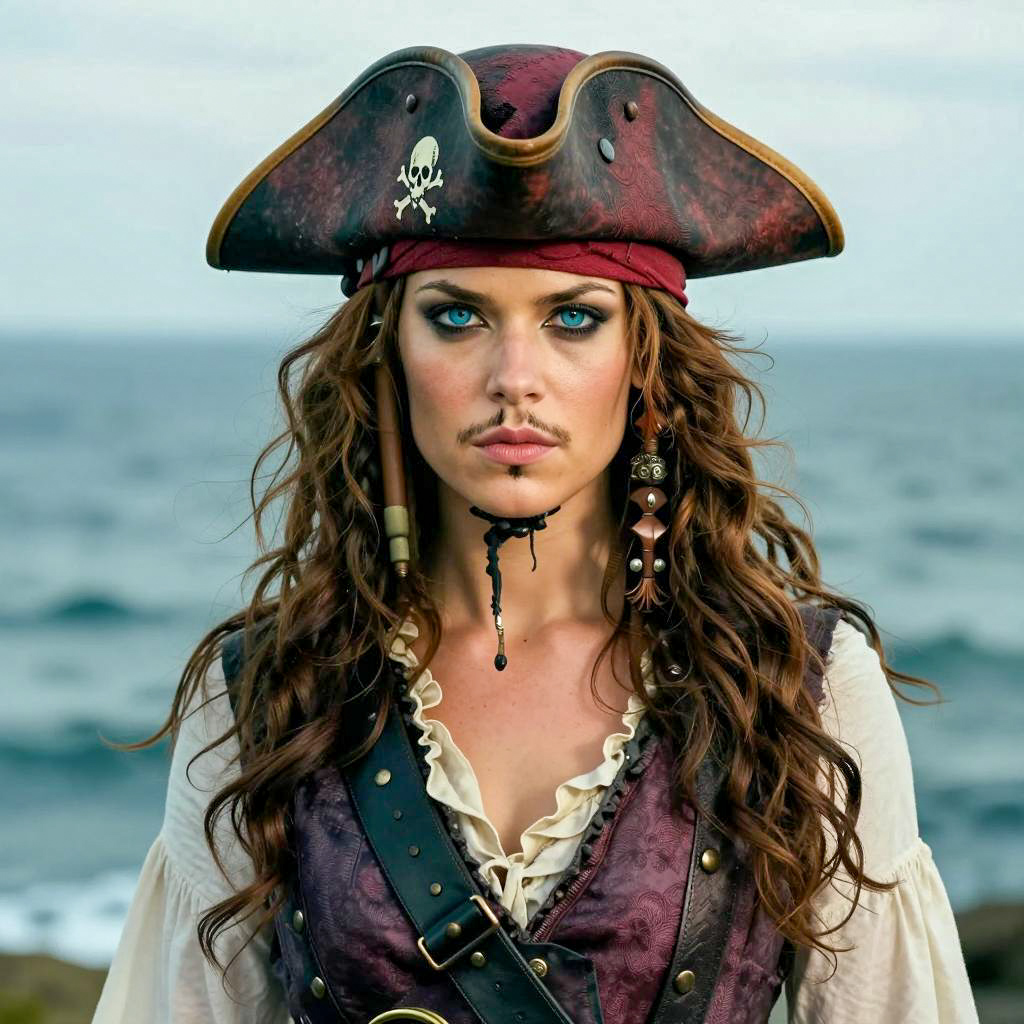Portrait of a woman dressed in a detailed pirate costume featuring a red tricorn hat with a white skull and crossbones, maroon vest over a white ruffled blouse, and black strap across her chest. She has long brown wavy hair, intense blue eyes, and a serious expression. The background shows an ocean scene under daylight, emphasizing a realistic pirate theme.