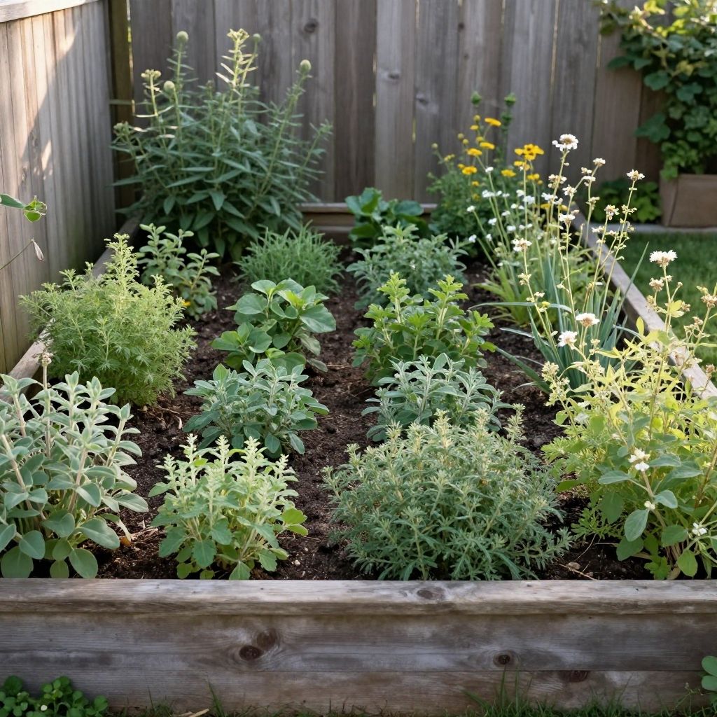 Minimalist cottagecore garden with neat rows of herbs and wild plants, rustic wooden fences, soft morning light casting gentle shadows, focus on simplicity and natural beauty.