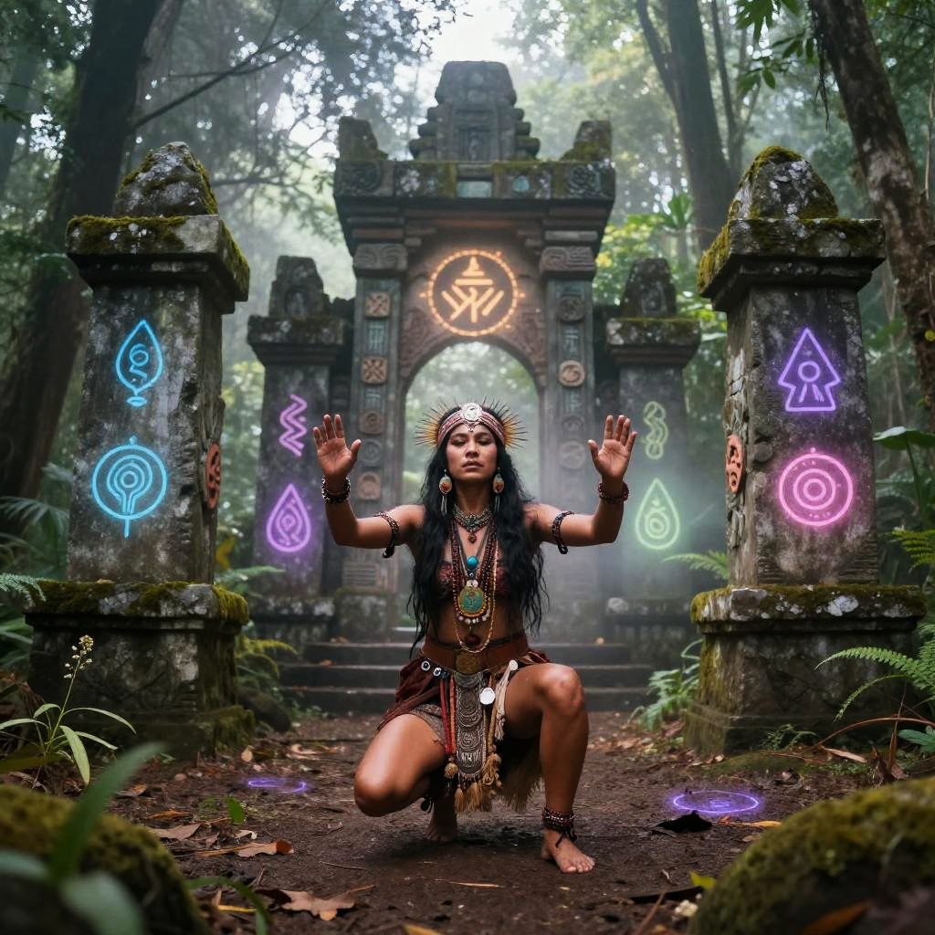 Mystical nativa shaman performing ritual in a sacred forest clearing, surrounded by ancient stone structures and glowing ethereal symbols, mist enveloping the scene, vibrant colors with magical realism atmosphere.