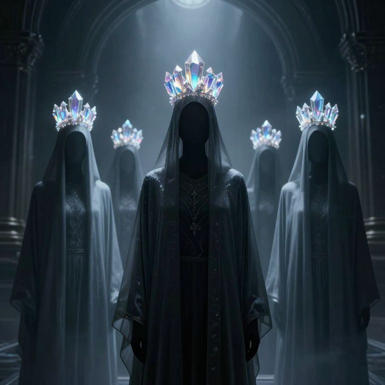 Digital art depicting four ghostly figures standing in a dimly lit, arched cathedral. Each figure is adorned with a glowing, crystalline crown and draped in a transparent, flowing veil. The central figure stands in the foreground, while three others are positioned symmetrically in the background. The figures are shadowy, with indistinct faces, and are clad in dark, ornate robes. The luminous crowns cast an ethereal blue light, enhancing the mysterious, otherworldly atmosphere. The arches and columns of the cathedral are barely visible, shrouded in darkness, adding to the eerie, supernatural setting.