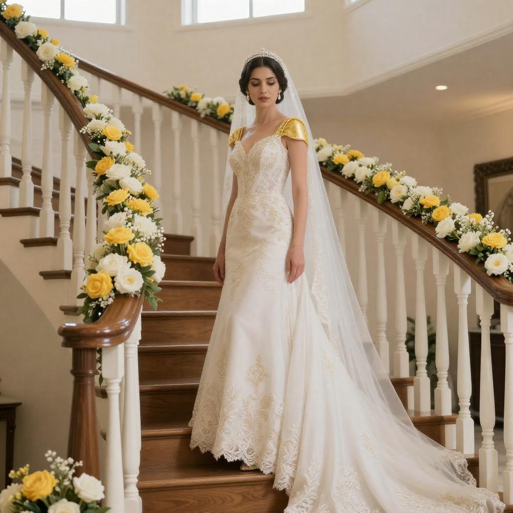 Photograph of a red-haired bride in a white floral dress with yellow accents and a long veil, standing on carpeted stairs. The staircase has white railings, floral garlands, and beige balusters. The bride looks back over her shoulder. Soft indoor lighting.