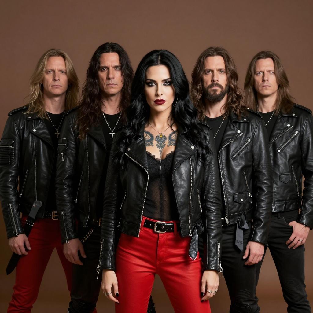 Portrait of a five-member rock band with long hair, standing against a brown background. The central female musician wears a black leather jacket, sheer black top, and red leather pants, showcasing chest tattoos. Four male band members surround her, dressed in black leather jackets with two wearing red pants and two in black pants, some holding gray fabric. All have intense expressions, embodying a rock and roll aesthetic.