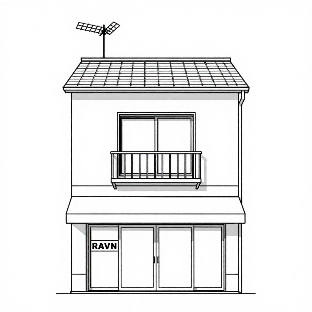 This is a black-and-white digital line drawing of a two-story building. The ground floor has a shop with a sign in Japanese and a "RAVN" store. The upper floor features a window with a small balcony and an antenna. The building has a simple roof and a central window. The drawing style is minimalist with clean, precise lines.