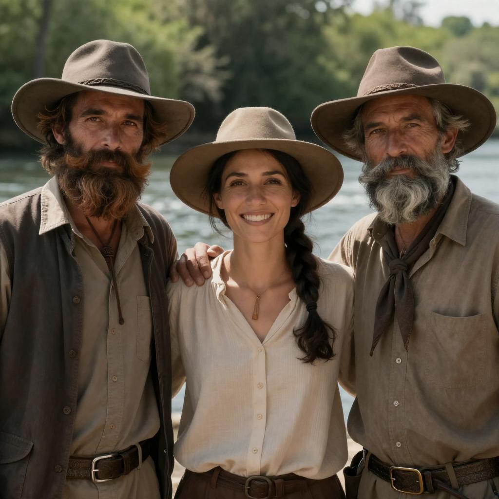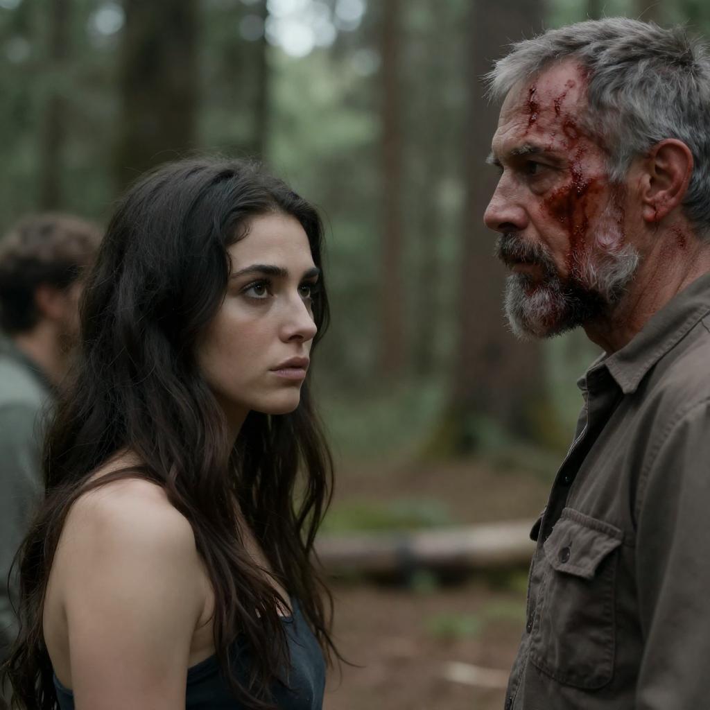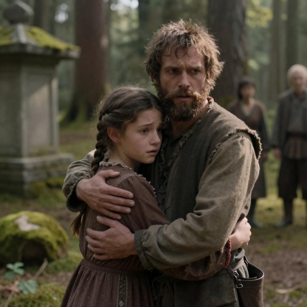 Photograph of a man and woman in a forest. Man with gray beard, fur hood, concerned expression. Woman with dark hair, braided, decorative headpiece, close to man, wide-eyed. Sunlight filtering through trees in background. Man's left arm around woman's shoulders.