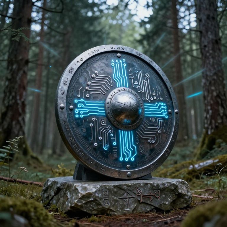 Norse AI visualized as an ancient Viking shield adorned with glowing AI circuitry and mystical runes, resting on a stone altar in a forest clearing with tall pine trees and ethereal light beams, combining traditional Norse symbolism with futuristic design.