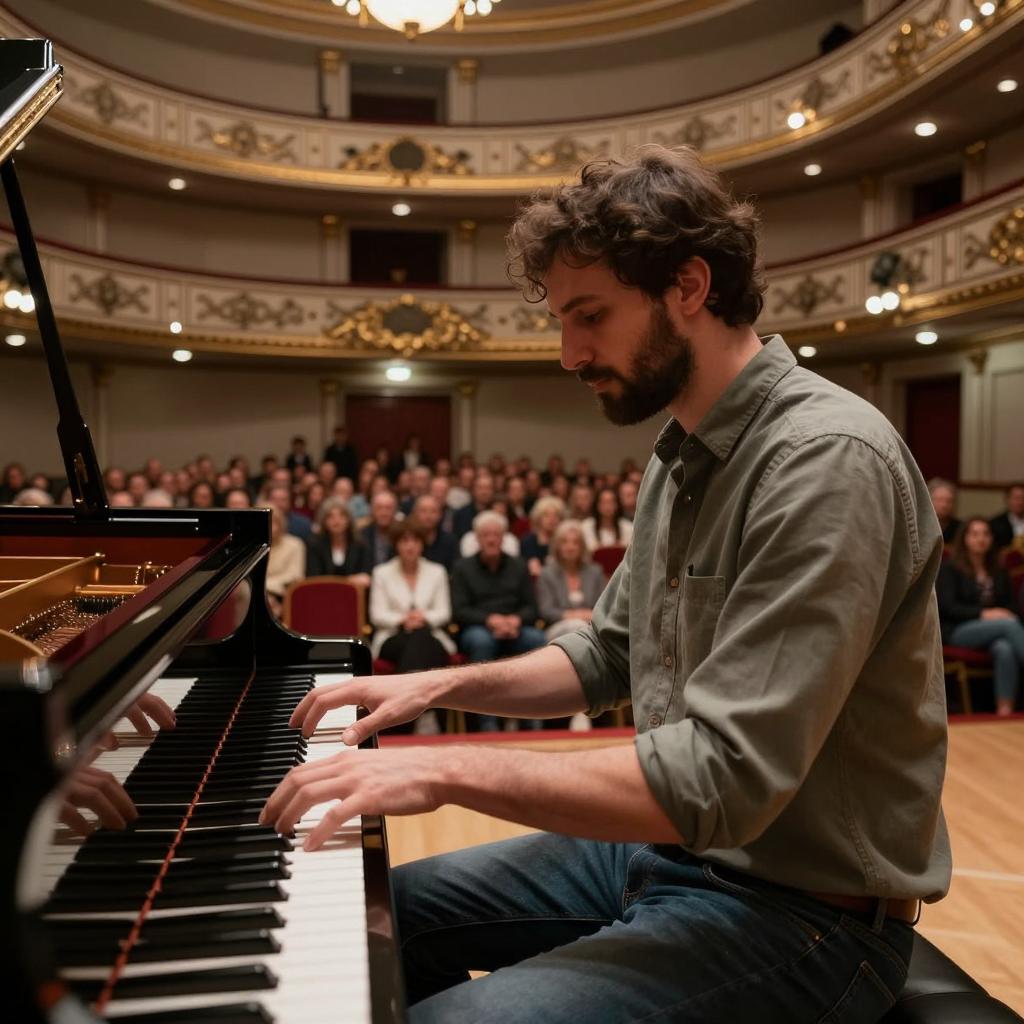 Man with dark hair and beard, wearing a green shirt and jeans, sitting at a grand piano in an ornate theater. Audience seated in the background, some standing. Dim lighting, visible stage lights above. Decorative moldings and framed artwork on walls. Piano in the foreground, man focused on playing. Approximately 50 people in the audience.