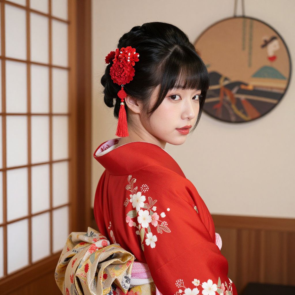 Traditional Japanese attire worn by a young woman, featuring a vibrant red kimono adorned with delicate white floral patterns, complemented by intricate black hair styled with two prominent red floral hairpins and cascading red tassels, set against a backdrop of wooden shoji screens and a circular wall decoration.