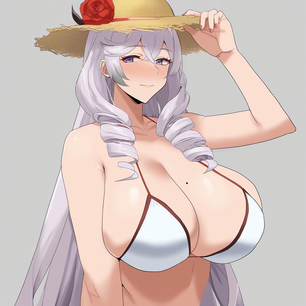 Algerie (azur lane), azur lane, 1girl, purple eyes, hair between eyes, mole under eye, grey hair, long hair, very long hair, white hair, large breasts, mole on breast, cleavage, white bikini, two-tone bikini, straw hat, hat flower, bare shoulders, twin drills, drill sidelocks, by artist minakami (flyingman555), leet