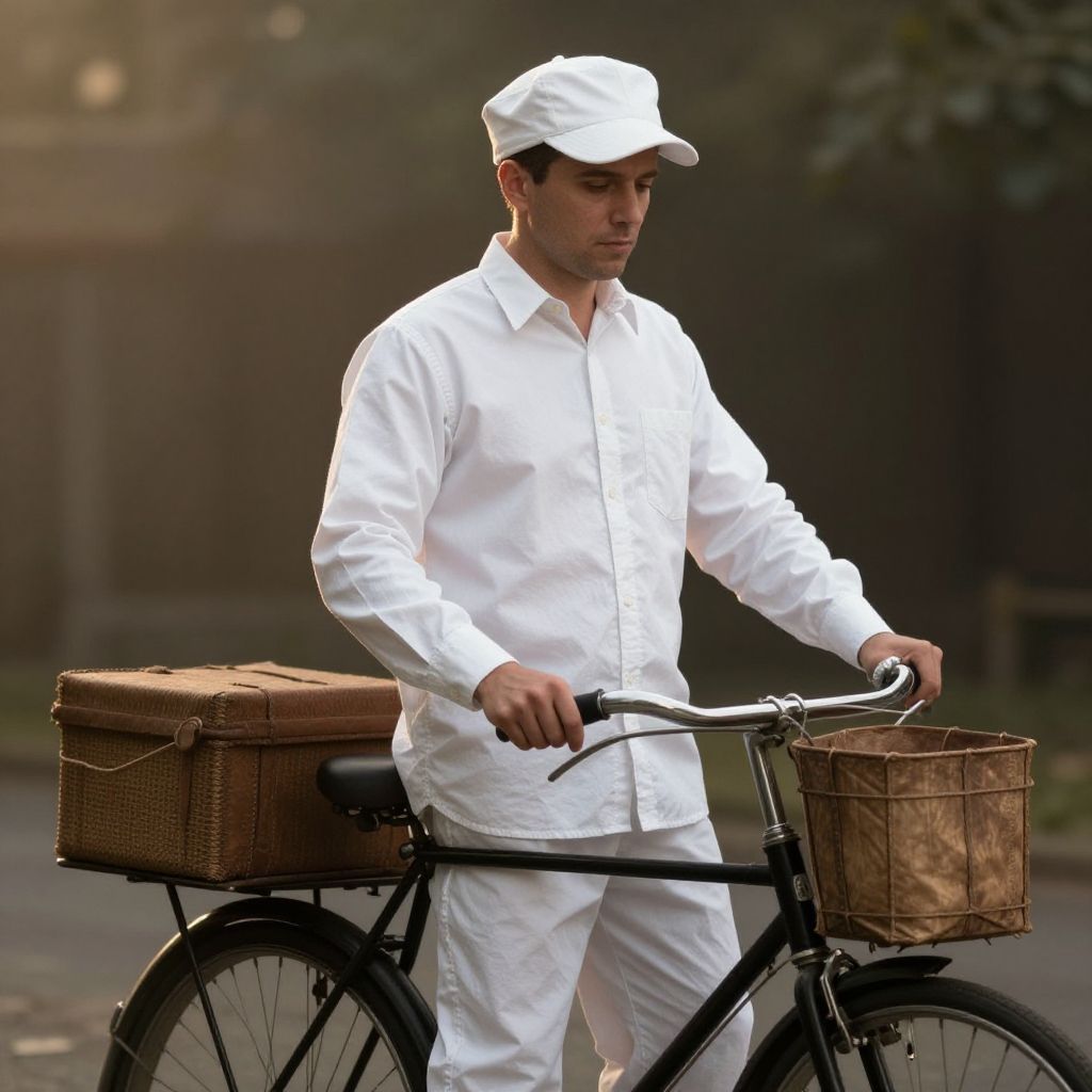Handmade milkman costume, white button-up shirt and vintage cap, classic milk delivery theme, detailed fabric wrinkles and accessories, posed by an antique bicycle with milk crate, soft morning sunlight, warm vintage tones, moody and atmospheric