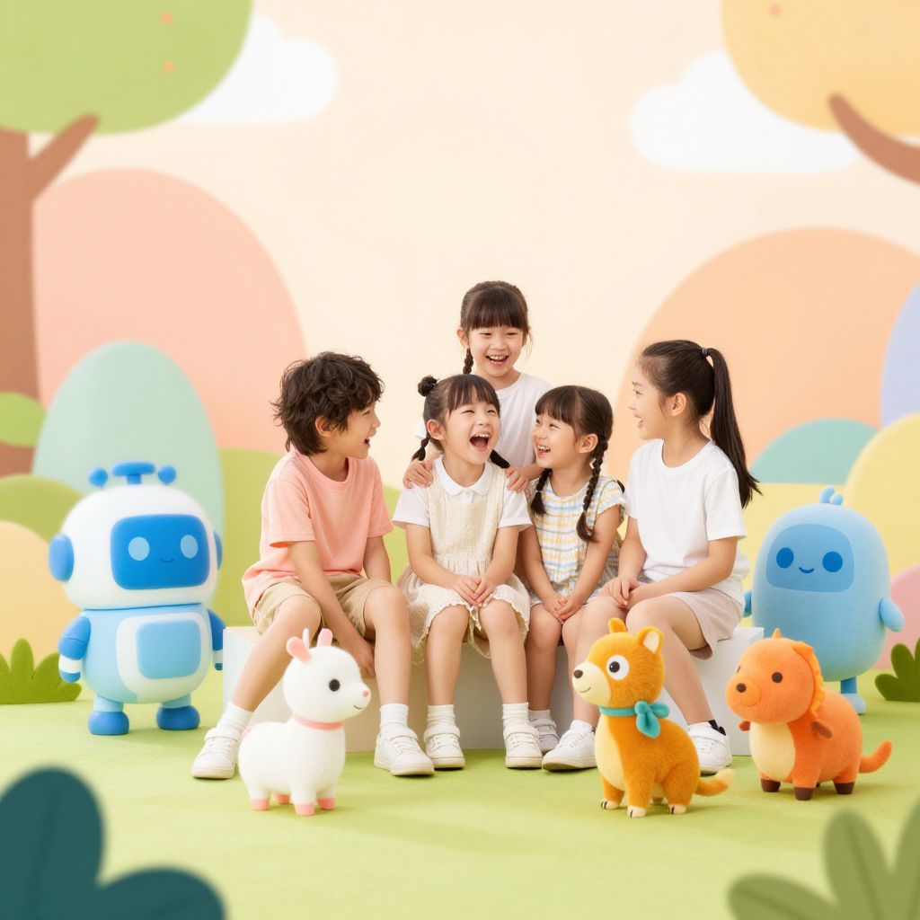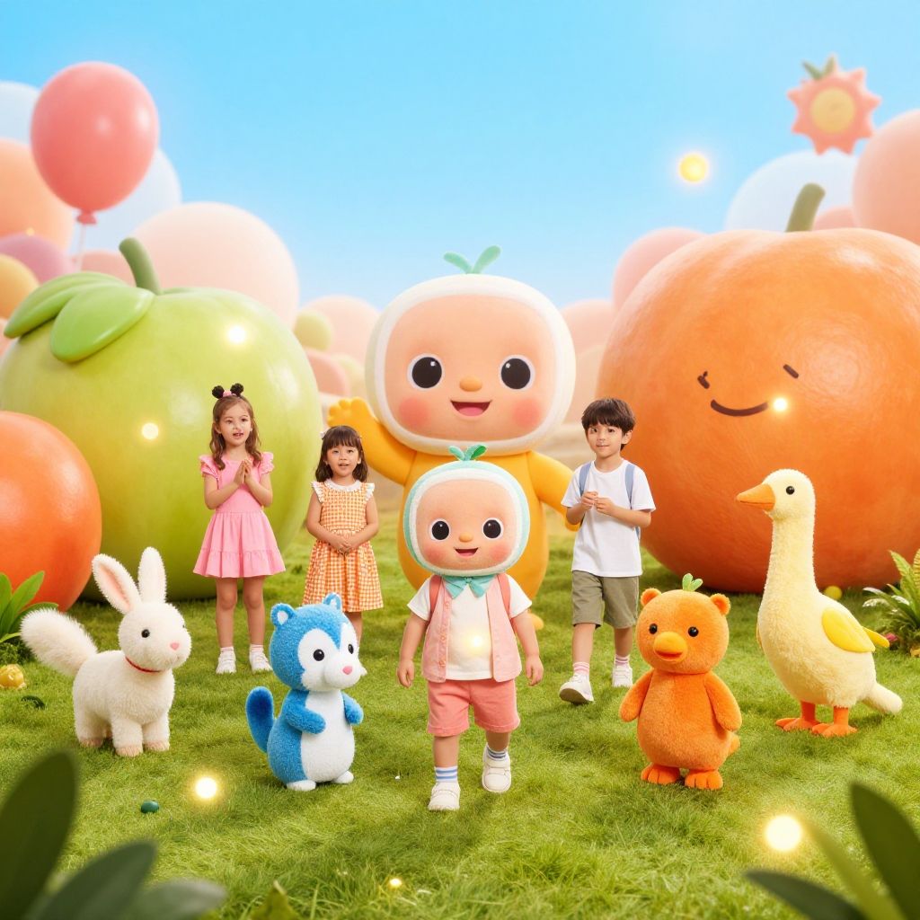 Cocomelon photoshoot set in a magical cartoon world, children dressed as characters from the series playing with animated animals and giant fruit props, vibrant colors and soft glowing effects emphasizing the fun and imaginative nature of the Cocomelon universe.