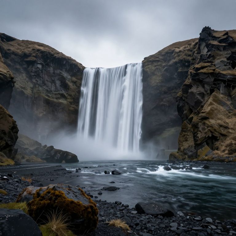 Photograph of a powerful waterfall cascading between dark, rugged cliffs into a misty, rocky stream, with overcast skies above.