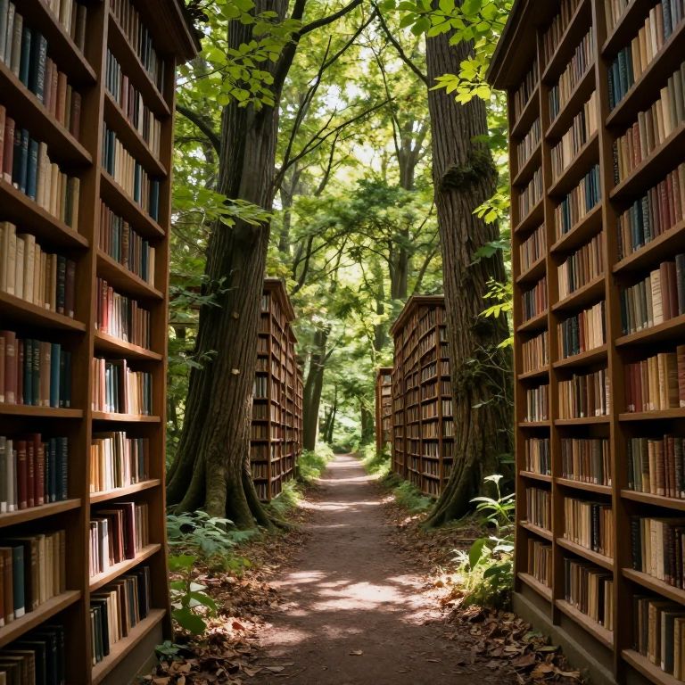 A serene woodland path transforms into a living library, where towering trees seamlessly merge with bookshelves, and sunlight filters through pages that rustle like leaves, inviting the soul to wander between worlds.