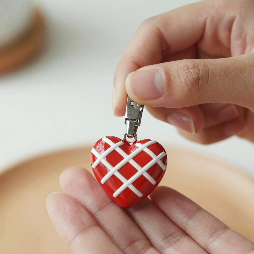 A close-up photograph of a person's hand holding a red, heart-shaped charm with white crosshatch patterns, attached to a small metal clip. The background is blurred with white and light brown colors. The person's fingernails are neatly trimmed and polished. The image focuses on the hand and charm, with a soft, natural light illuminating the scene.
