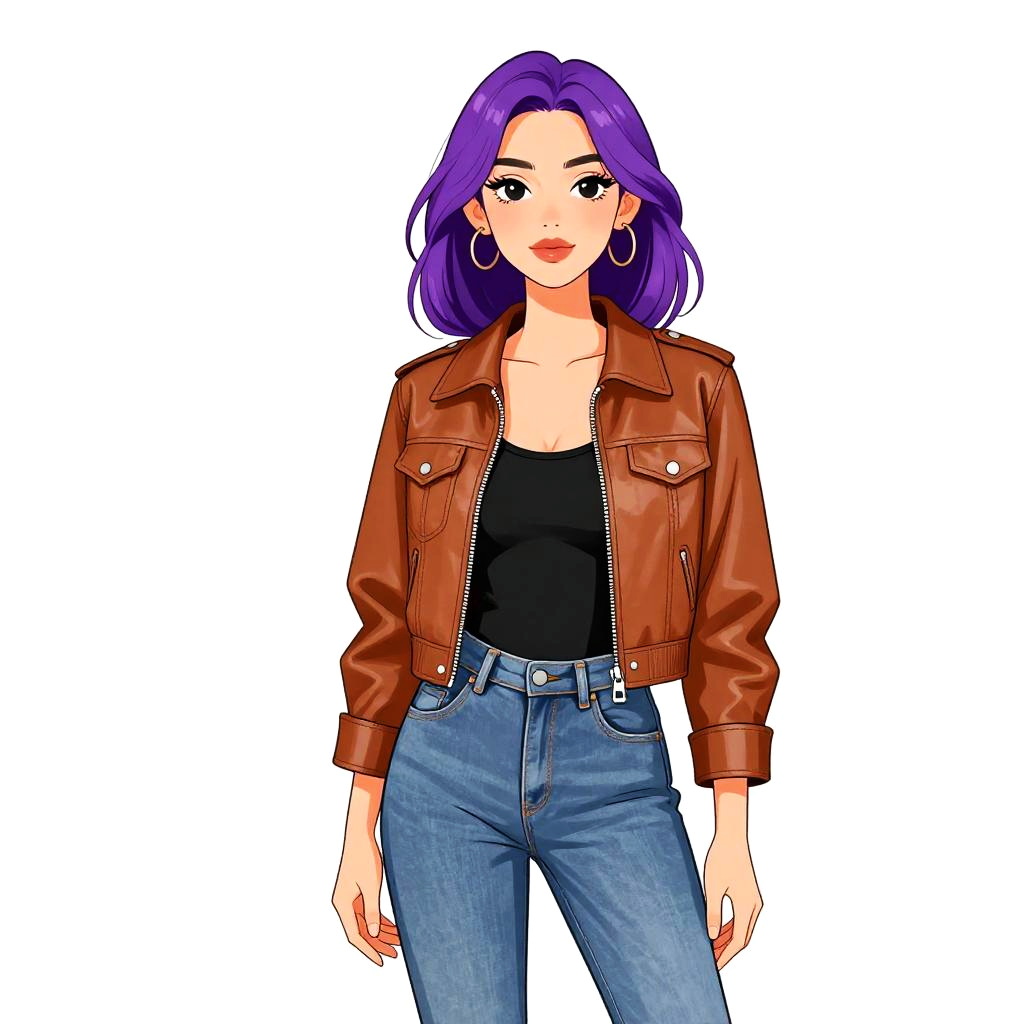 Woman with pretty face and pretty hair. Woman, modern streetwear, denim romper in light wash, short sleeve with cuffed hems, collared neckline, front zipper closure with O-ring pull, form-fitting with cinched waist, thigh-length shorts, white background. --sref 1467