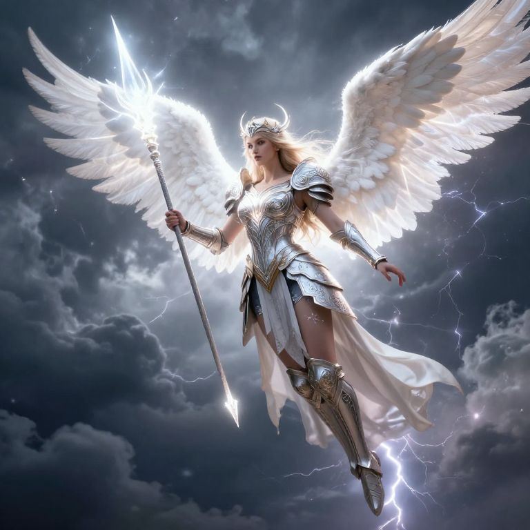 Female archangel warrior soaring through stormy skies, ornate armor adorned with intricate celestial runes, massive white wings glowing with divine light, holding a luminous spear, dramatic clouds and lightning illuminating the scene, fantasy art style